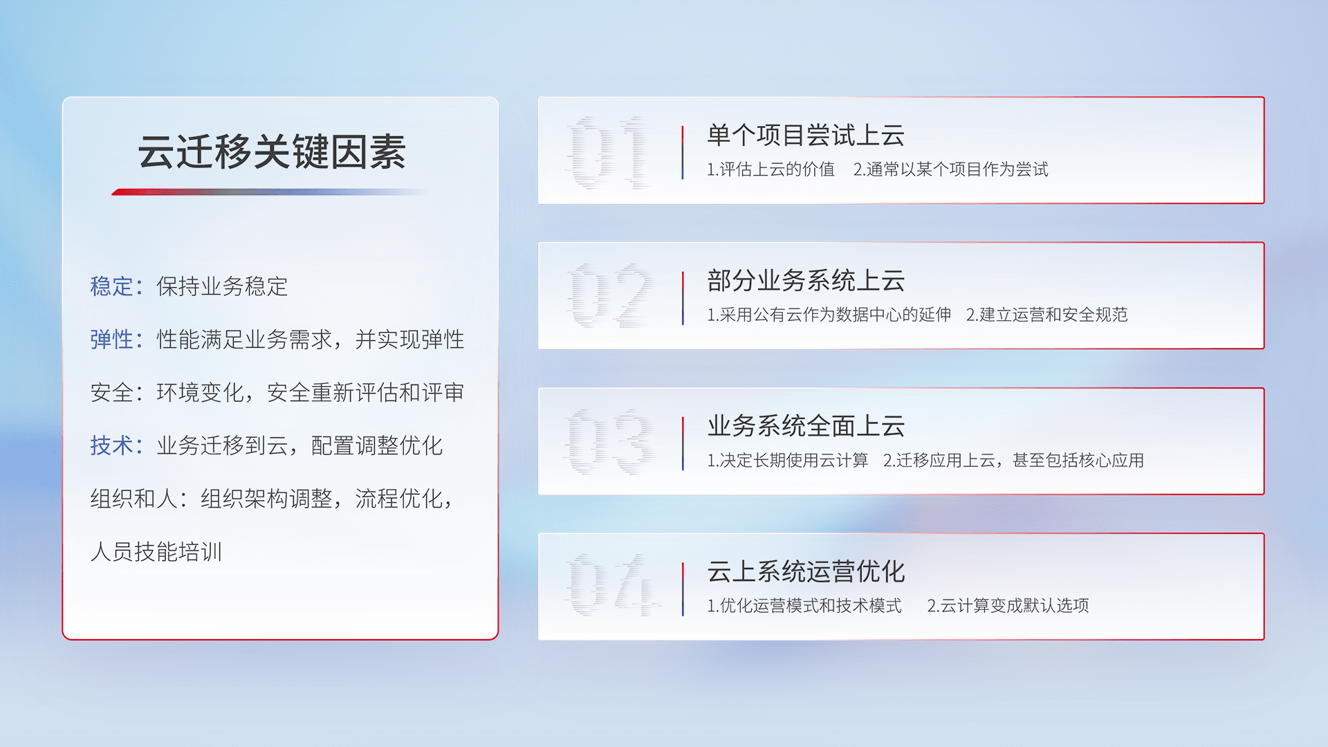 结合实际业务,,,,从规划设计、、、、云平台选型、、、云原生改造、、、数据迁移、、集成交付,,迁移全过程为客户识别最佳上云路径,,,做好风险识别管理,,,设计网络架构、、身份权限、、、、安全审计合规、、、操作审计、、日志审计、、、监控告警策略、、多站点容灾设计等,,,对云上基础设施进行整体规划,,提升IT治理水平,,以满足弹性、、、高可用、、高性能的需求。。