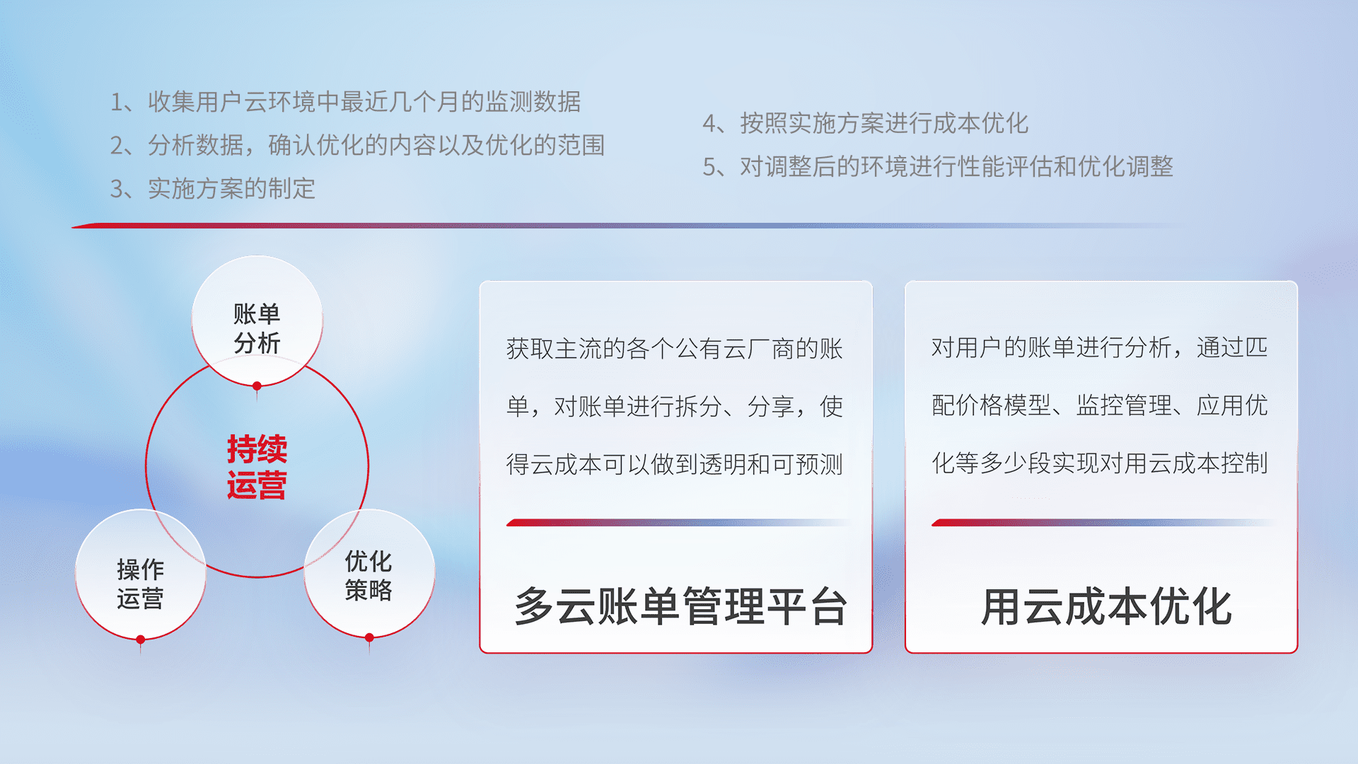 通过多云纳管,,以统一的资源数据模型把客户的云资源进行抽象和封装,,,进而实现对多云资源的统一操作,,,保障云资源管理的可靠性、、稳定性与可用性。。量身定制化运维内容,,配置、、、、开发运维、、、补丁管理、、、备份、、、监控、、、认证和访问管理、、、审计和日常巡检等,,,保障在用云过程中的可靠度,,,稳定度以及高可用率。。